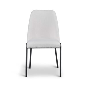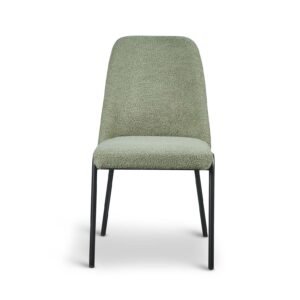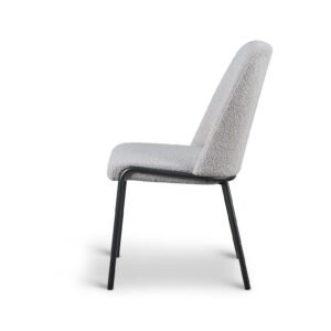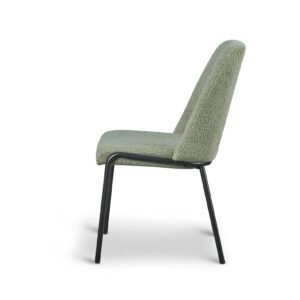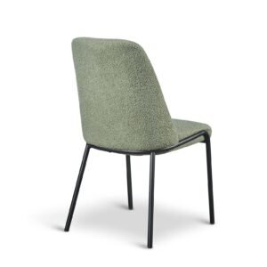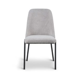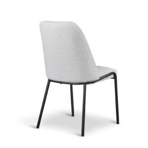 The Teddy Boucle Fabric Italo Dining Chairs offer a practical and updated approach to seating for your dining room. These chairs are upholstered in a curly teddy boucle fabric. These teddy boucle chairs are available in three colours: light grey, sage green, and white. The striking white curly design contrasts with the black metal legs, giving the chair a comfy and bright modern look, perfect for contemporary spaces. The sage green adds a touch of muted colour to your dining room, and will pair well with brown and dark green accents. The light grey offers neutrality, making it the easiest to pair with existing decor. The boucle fabric ensures the chairs are unique and stand out in your home.